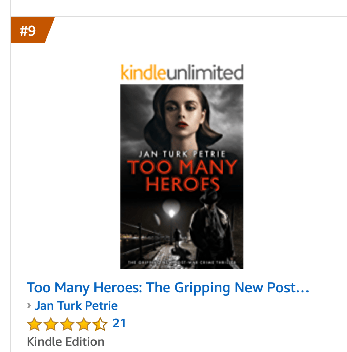 Too Many Heroes at #9 July 18, 2021janturkpetrie Delighted that ‘Too Many Heroes’ is currently at #9 in Crime Thrillers on Amazon!! Share this: Click to share on X (Opens in new window) X Click to share on Facebook (Opens in new window) Facebook Like Loading... Related